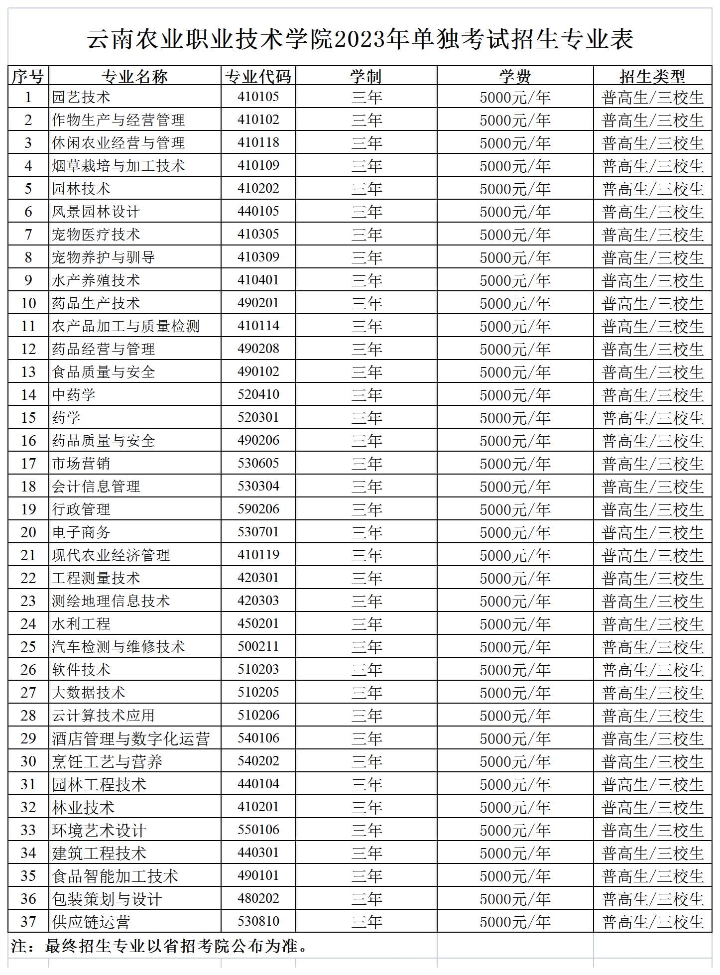 云南农业职业技术学院2023年单独考试招生专业表